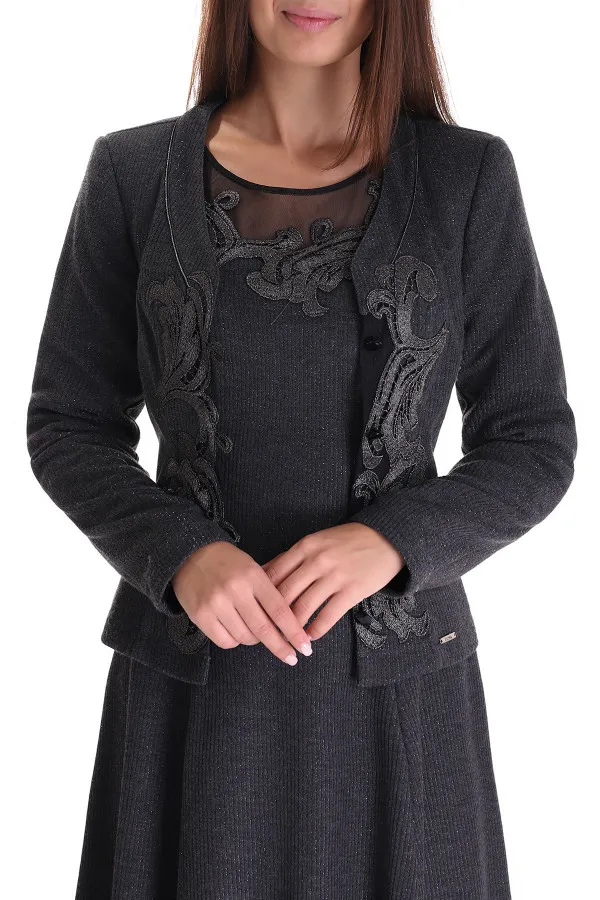 .Elegantan sako izrađen od trikotažnog materijala sa metaliziranim nitima. Liniju kopčanja oplemenjuju elementi od tila sa našivenom čipkom. Vrlo je prijatan prilikom nošenja I pruža Vam komforan osećaj. Lako se kombinuje sa haljinom iz iste linije, a i sa ostalim modelima.