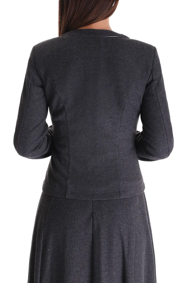 Elegantan sako izrađen od trikotažnog materijala sa metaliziranim nitimaLako se kombinuje sa haljinom iz iste linije, a i sa ostalim modelima.