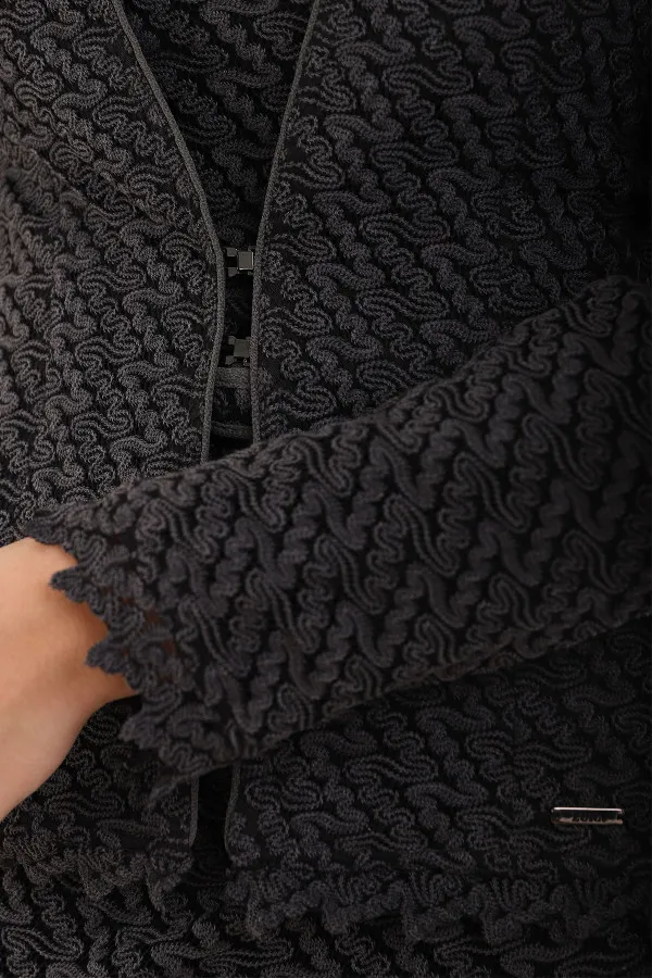 Elegantni strukirani sako u crnoj boji sa dugim rukavima.