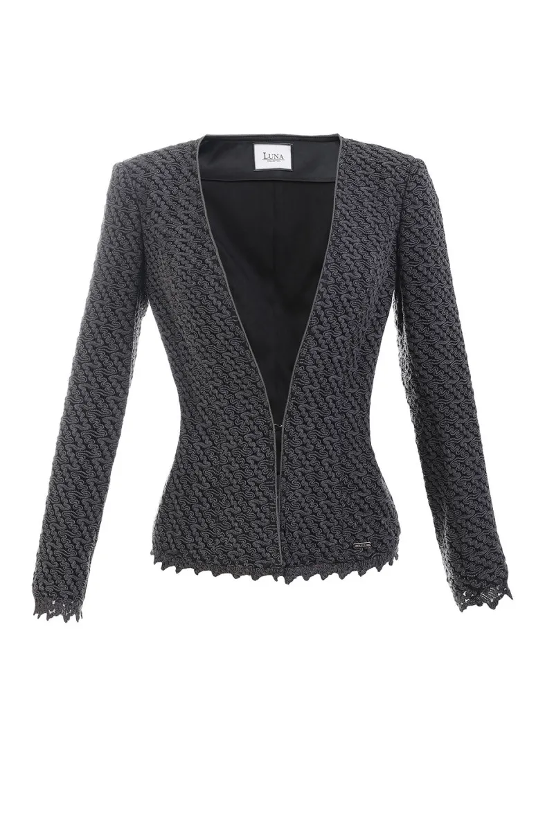 Elegantni ustručeni sako od čipke. Kroj prati liniju tela i prilagođava mu se na veoma elegantan način. Pamučna čipka od koje je napravljen je zbog visokog procenta elastina veoma rastegljiva i čini sako veoma udobnim. Postava koja se nalazi ispod čipke omogućuje čvrstu formu i oblik ovom modelu ali ujedno pruža i savršenu udobnost tokom nošenja.