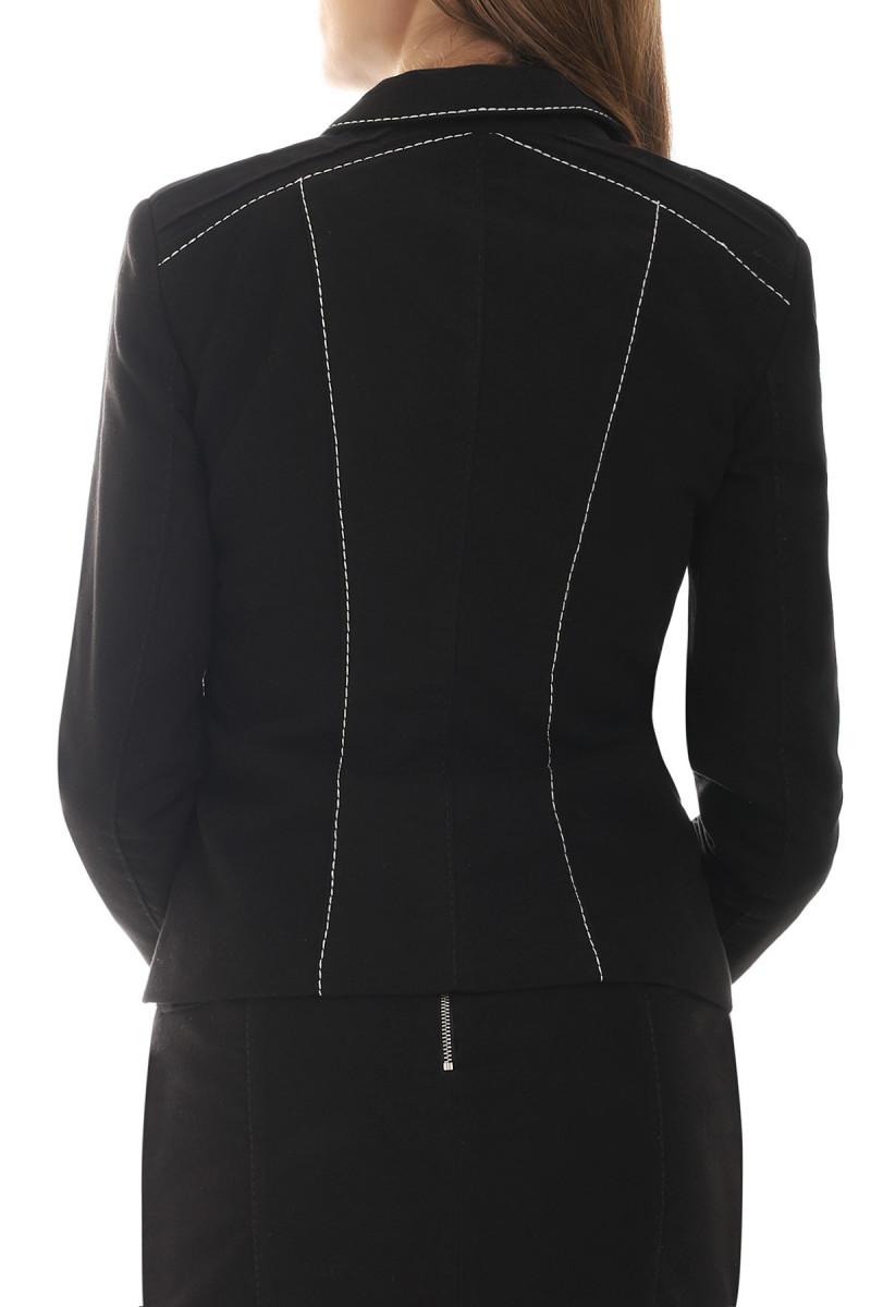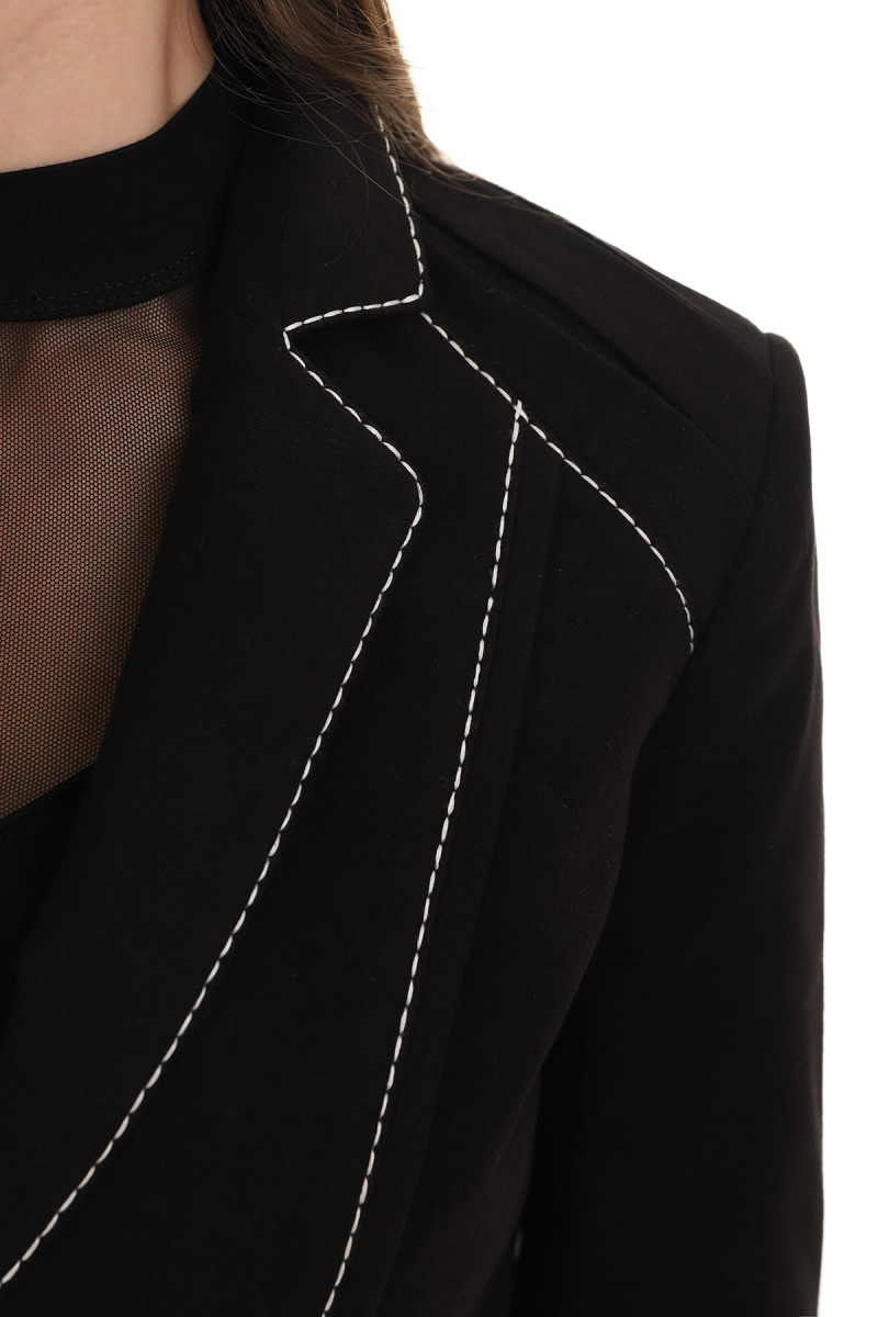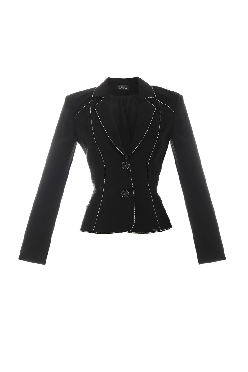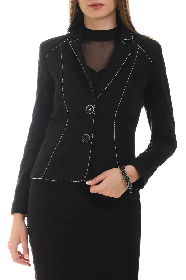 Klasičan crni sako je omiljeni komad poslovnih žena. Kopčanje u centralnom delu će Vašu figuru vizuelno suziti i istaći struk. Štep odrađen belim koncem čini ovaj model unikatnim. Veoma je priijatan za nošenje čemu najviše doprinosi postava od viskoze. Odlično se kombinuje uz sve pantalone i jednostavne bluze i košulje.