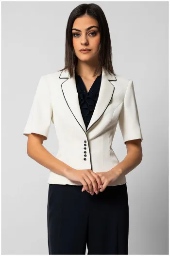 Elegantni crno-beli sako za svečane prilike, sa kontrastnim ivicama i dekorativnim kopč...
