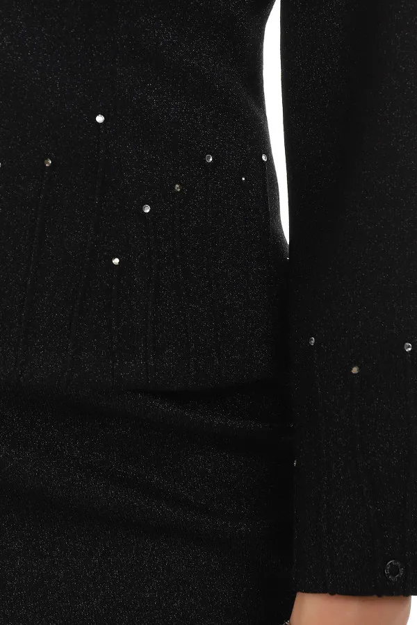 Sako crne boje odičan je izbor za svečane prilike. Viskozna pletnina od koje je napravljen u sebi sadrži metalizirana vlakna koja svetlucaju i čine ovaj model dodatno glamuroznim. Elastin u materijalu pruža osećaj udobnosti. Kopčanje u centralnom delu će istaći Vaš struk.