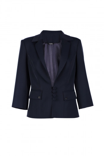 Strukirani sako klasičnog kroja od glatkog materijala. Liniju kopčanja krasi elegantni dodatak koji se odlično uklapa sa modelima iz iste linije, ali se po potrebi može skinuti. Lako se kombinuje sa suknjama i pantalonama iz iste linije.