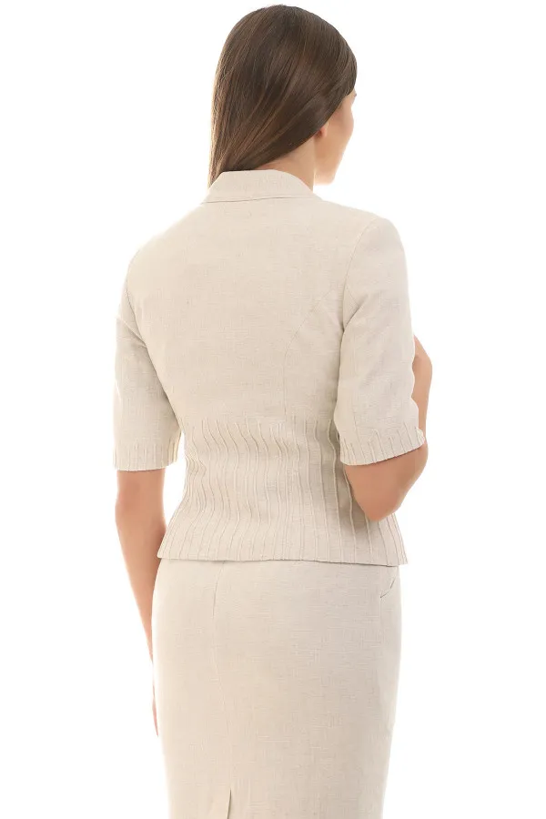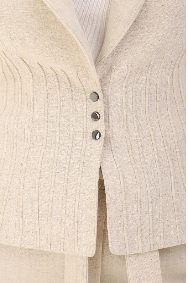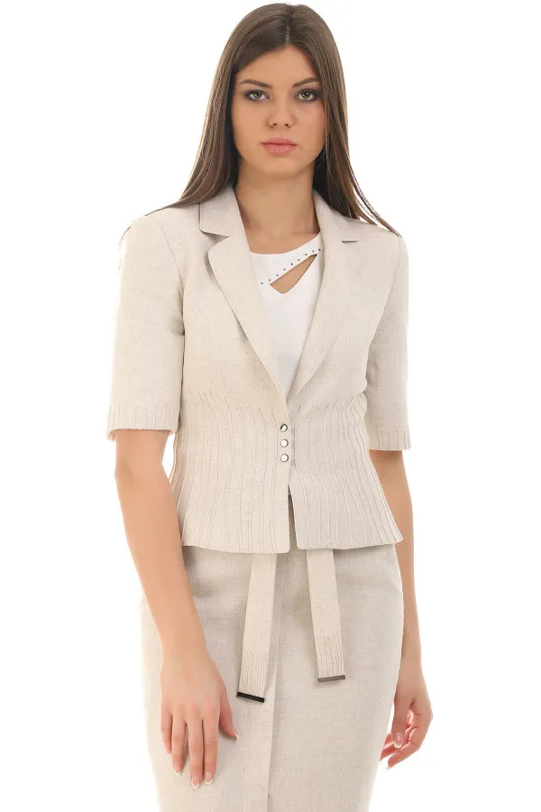 Kratki strukirani sako u nežnoj bež nijansi koji unosi prefinjenu otmenost u svaki outf...