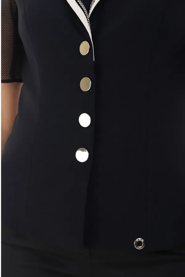 Elegantni crno-beli sako za svečane prilike, sa kontrastnim ivicama i dekorativnim kopč...
