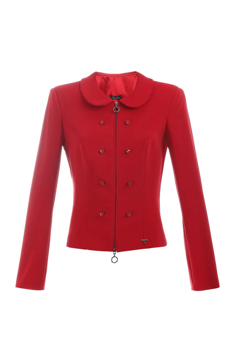 Elegantni strukirani sako u crvenoj boji sa dugim rukavima.