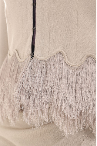 Strukirani kratki bež sako za posebne trenutke. Od linije stuka na dole prostiru se specifične resice koje ga čine vrlo upečatljivim i ekstravagantnim. Kombinovanjem sa suknjom iz iste linije dobićete savršen outfit.