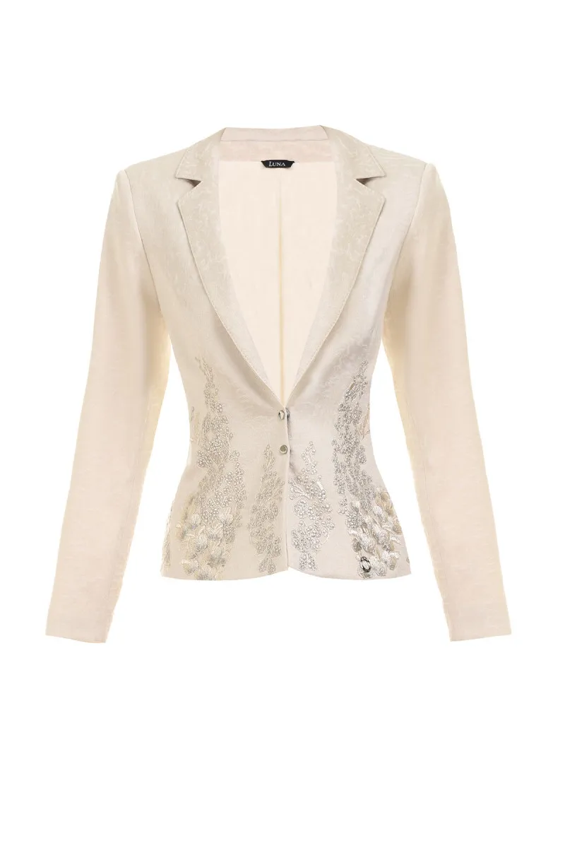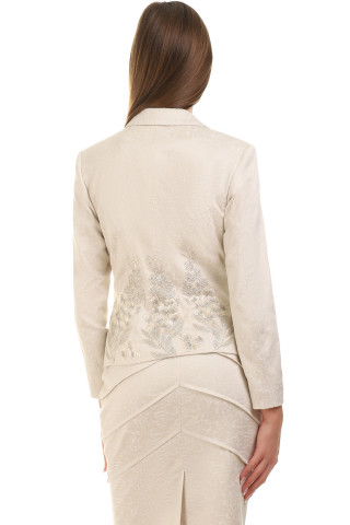 Elegantni bež sako sa jedinstvenim cvetnim aplikacijama. Sako se kopča u centralnom delu zbog čega dodatno ističe Vaš struk. Zahvaljujući kvalitetnom materijalu od koga je izrađen veoma je prijatan za nošenje. Za postizanje savršene stilske usklađenosti predlažemo da ga kombinujete sa haljinama i suknjama iz iste linije.
