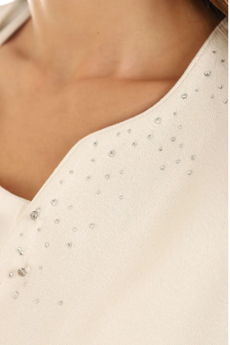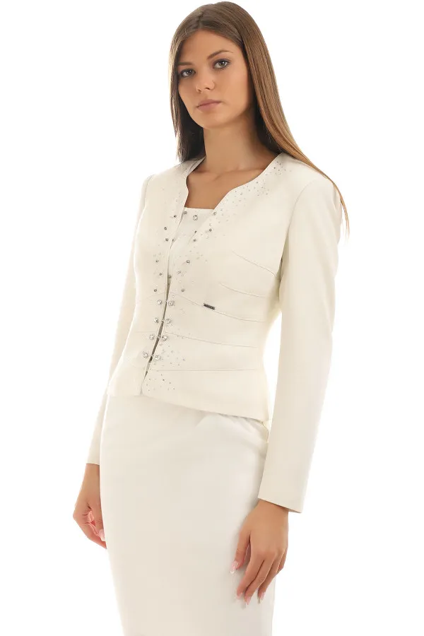 Strukirani kraći sako sa metaliziranim vlaknima koja čine ovaj model dodatno glamuroznim. Linija dekoltea i kopčanja oplemenjena je autentičnim cirkonima. Elastin u materijalu pruža osećaj udobnosti i tokom višesatnog nošenja. Možete ga kombinovati sa haljinama iz iste linije i dobiti savršeni outfit, kako za svečanu tako i za poslovnu priliku.