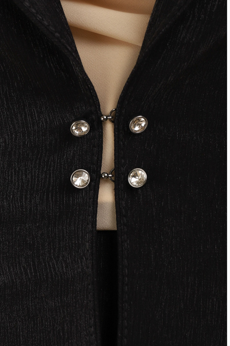 Elegantni crno-beli sako za svečane prilike, sa kontrastnim ivicama i dekorativnim kopč...