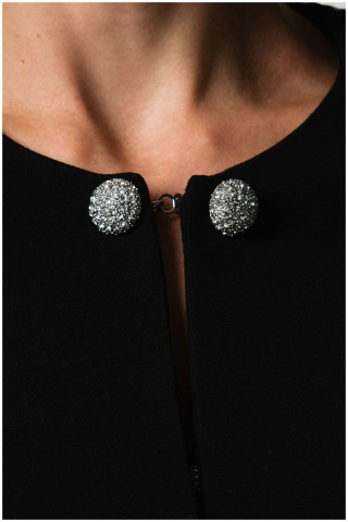 Elegantni crno-beli sako za svečane prilike, sa kontrastnim ivicama i dekorativnim kopč...