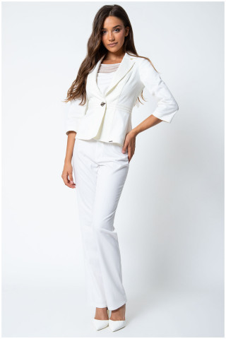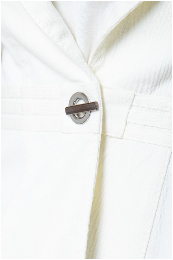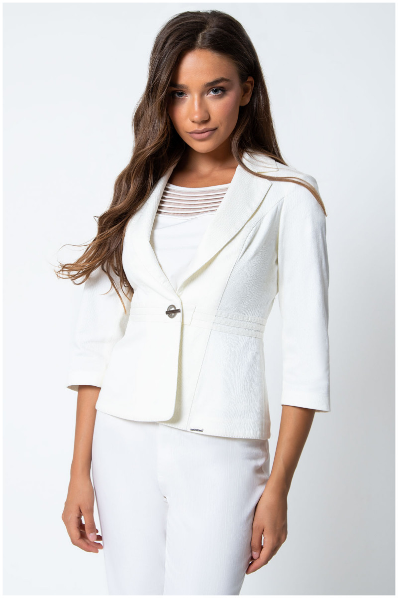 Beli strukirani sako sa 3/4 rukavima. Izrađen je od pamuka i elastina što ga čini veoma udobnim za nošenje. Model poseduje kragnu s nazubljenim reverima.