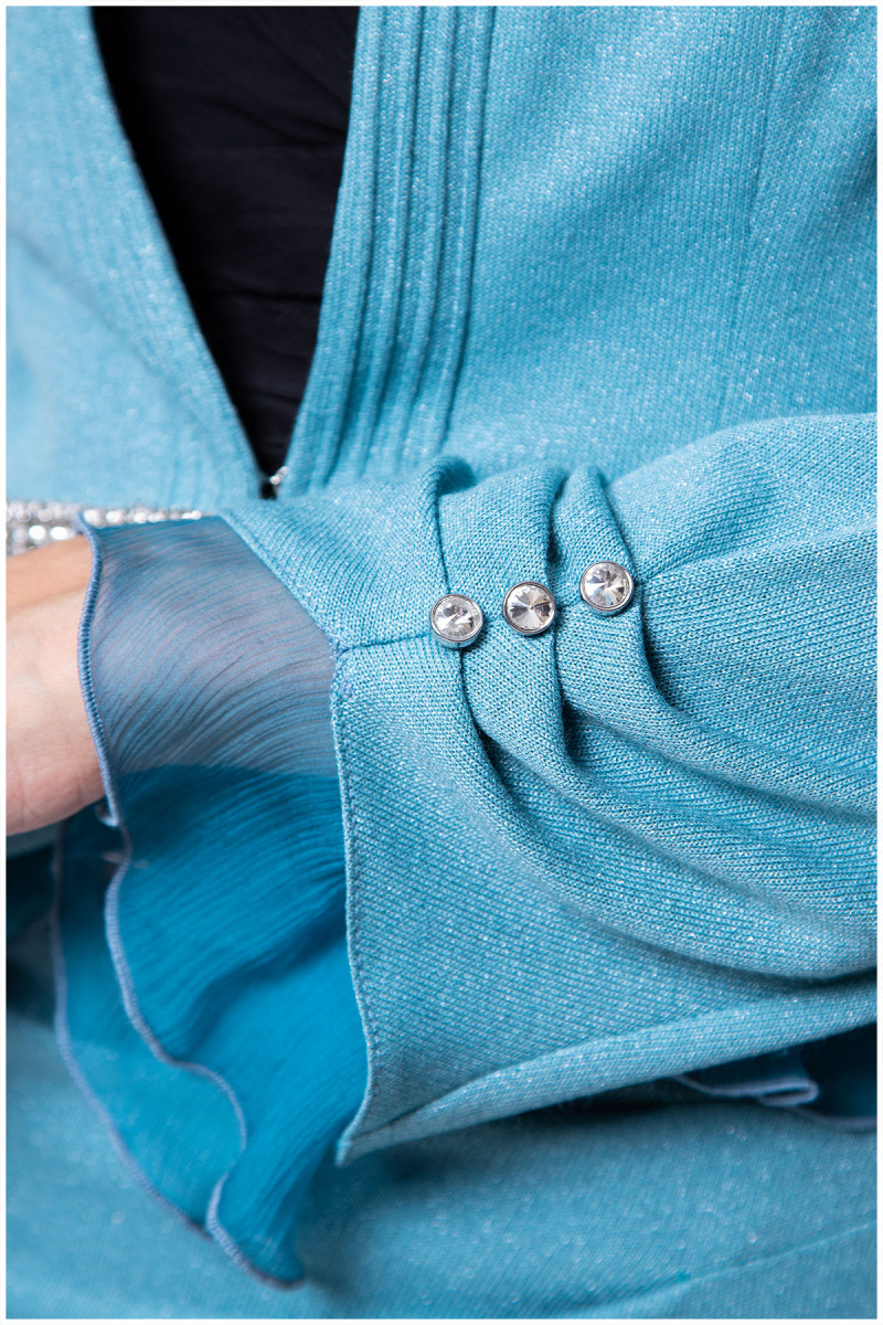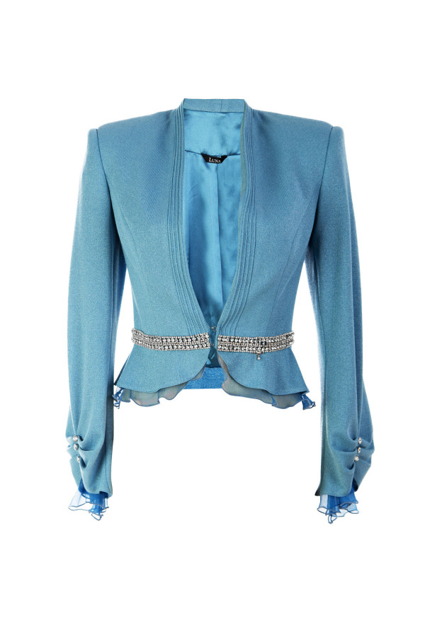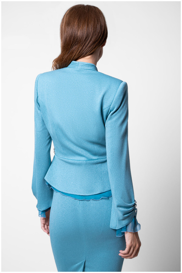 Moderan strukirani sako bez revera oplemenjen ukrasnim detaljima u predelu struka i lepršavim karnerima na rubovima.