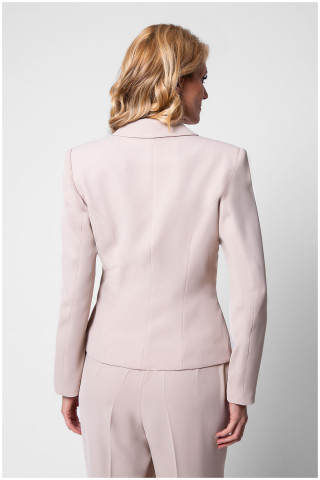 Strukirani sako dugih rukava u bež boji. Oplemenjen je paspulima duž cele prednje strane. Kopčanje uz pomoć jednog dugmeta na sredini. Odlično se kombinuje sa ostalim modelima iz iste kolekcije.