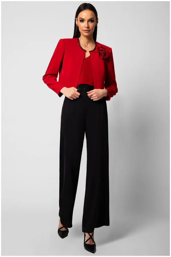Elegantni crveni sako kraćeg kroja oivičen detaljem u srebrnoj boji, savršeno se kombinuje sa modelima iz prateće kolekcije.