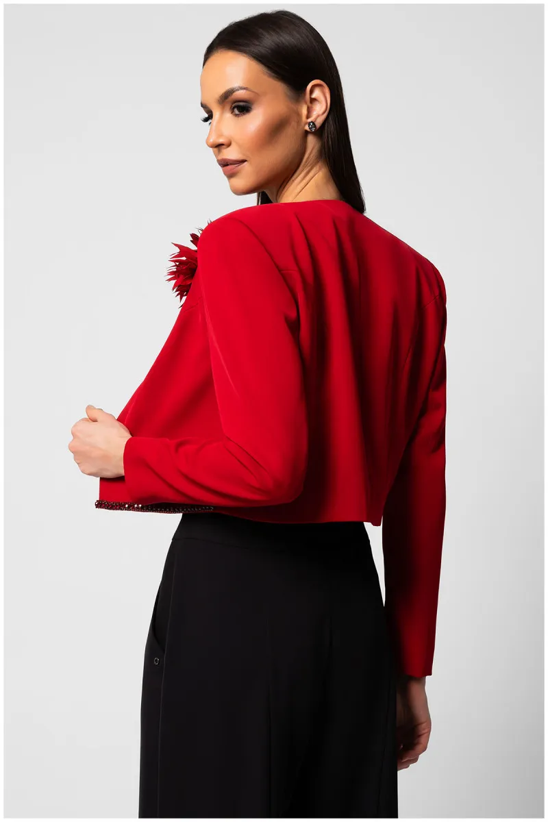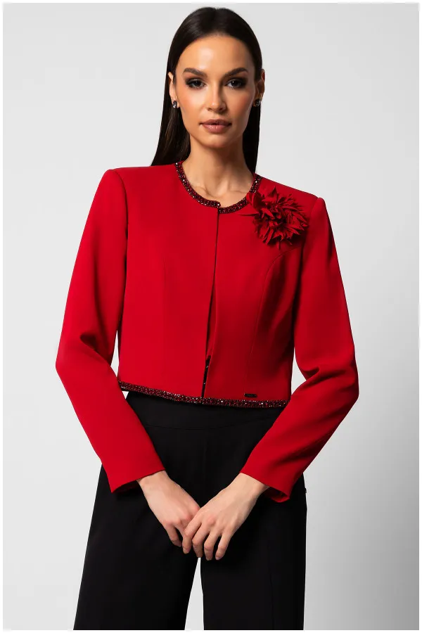 Elegantni crveni sako kraćeg kroja oivičen detaljima u srebrnoj boji. Ovaj model se kopča po sredini i strukiran je dok okrigli izrez doprinosi sofisticiranom izgledu. Savršeno se kombinuje sa modelima iz prateće kolekcije.