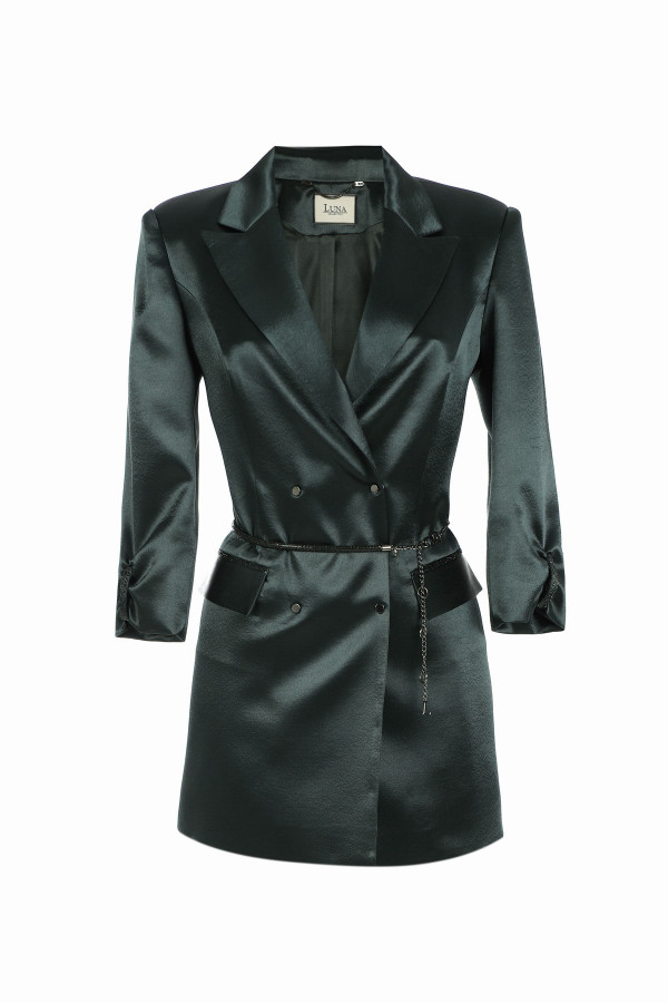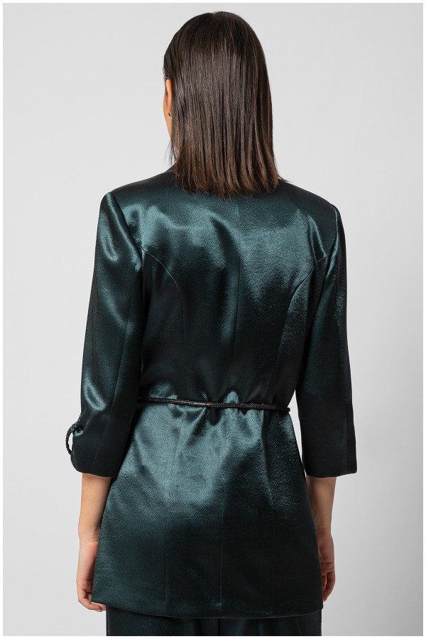 Elegantan zeleni sako 3/4 rukava. Model savršeno oblikuje figuru zahvaljujući strukiranom kroju tankom kaišu u vidu nakita. Odlično se kombinuje sa komplementarnim pantalonama iz iste linije kreirajući efektan outfit.