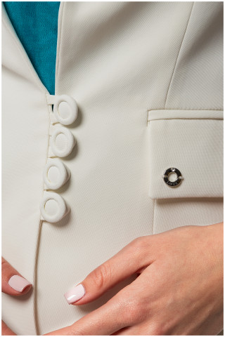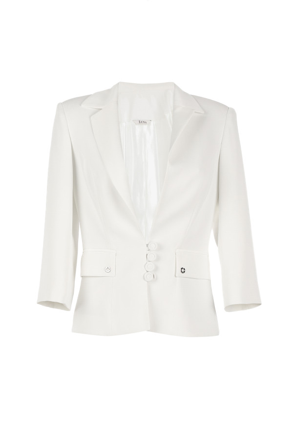 Elegantni beli sako 3/4 rukava. Model je strukiran, naglašavajući figuru i poseduje džepove na preklop. Odlično se kombinuje sa ostalim modelima iz Luna kolekcije.