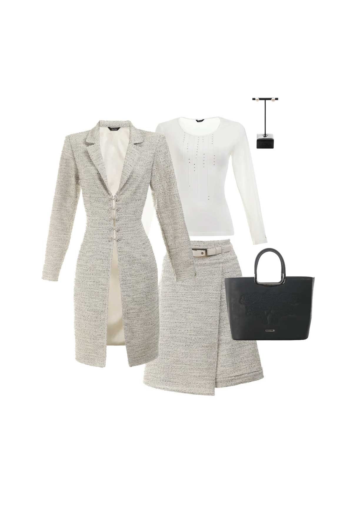 Bež-zlatni mantil protkan lame vlaknima savršeno se slaže sa pantalonama i suknjom iz i...