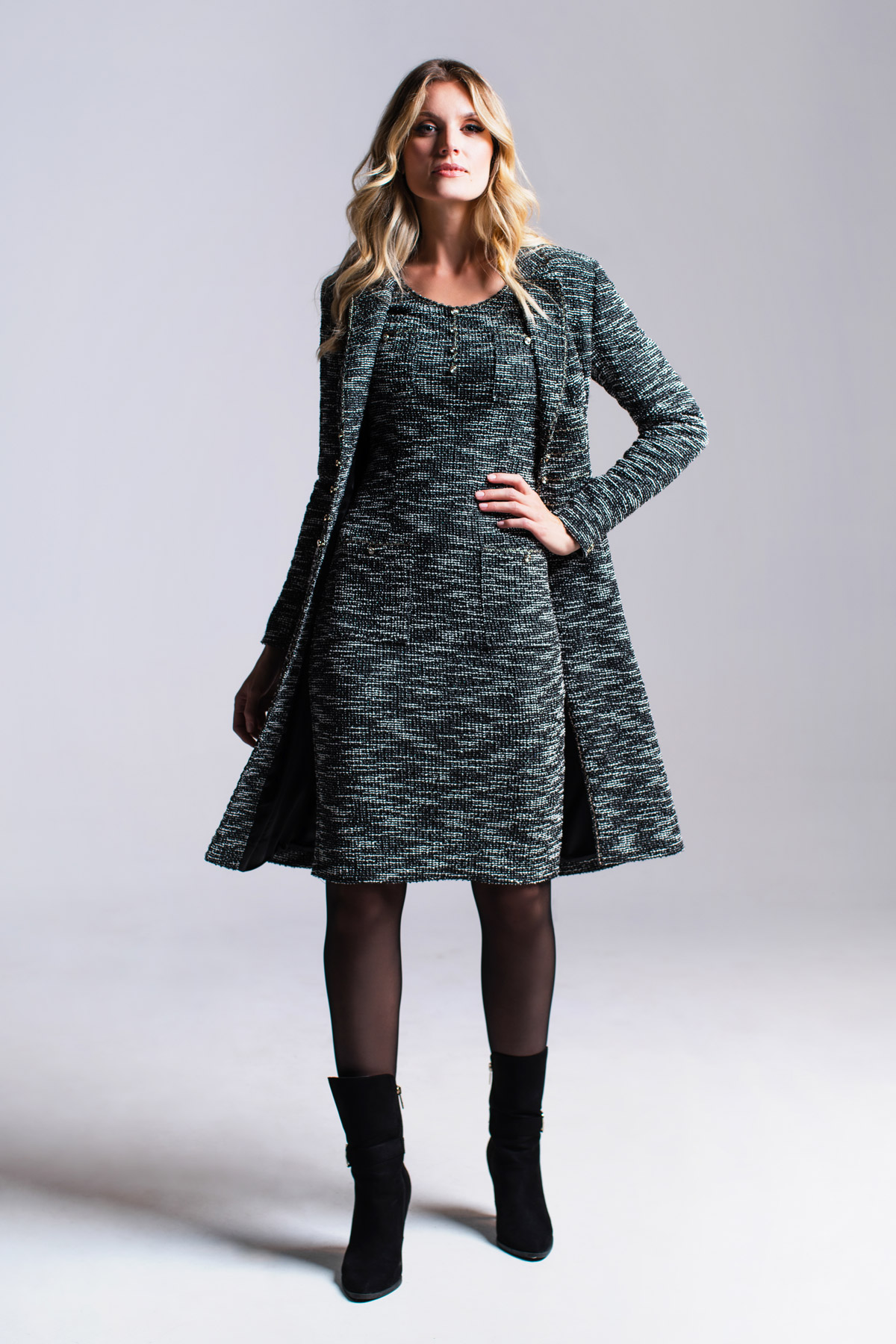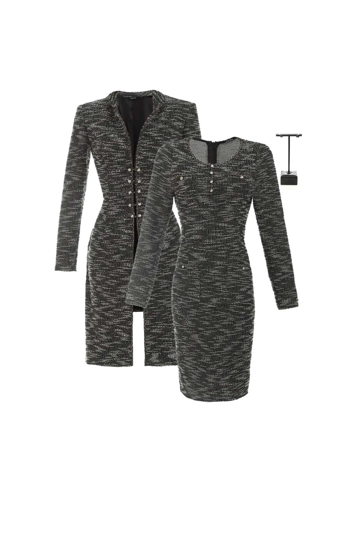 Crno-beli mantil protkan lame vlaknima savršeno se slaže sa pantalonama i suknjom iz is...