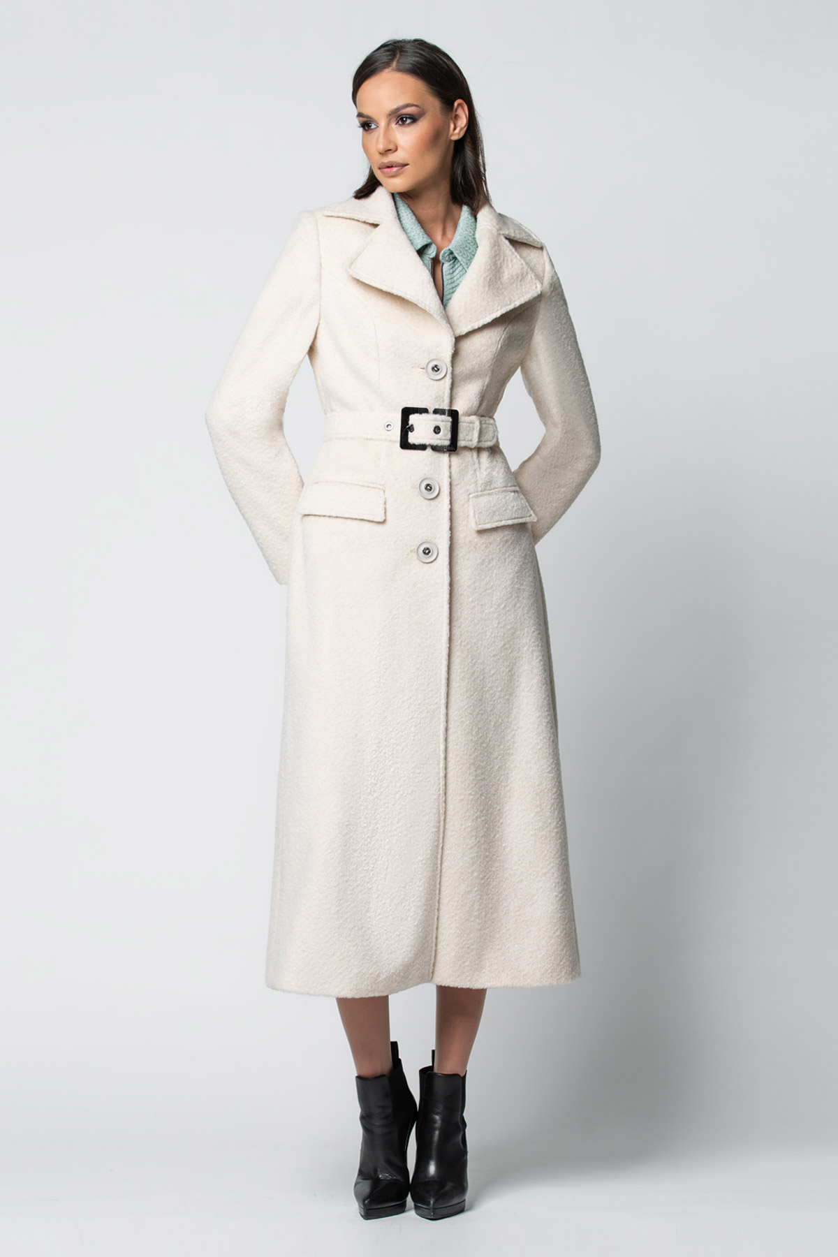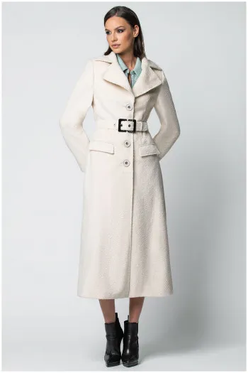 Elegantni midi kaput u beloj boji odličan je izbor za hladnije dane.