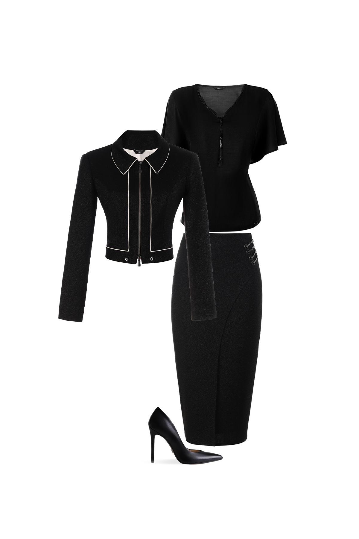 Crni sako dužine do bokova sa dugim rukavima, odlično se kombinuje sa suknjom iz iste l...