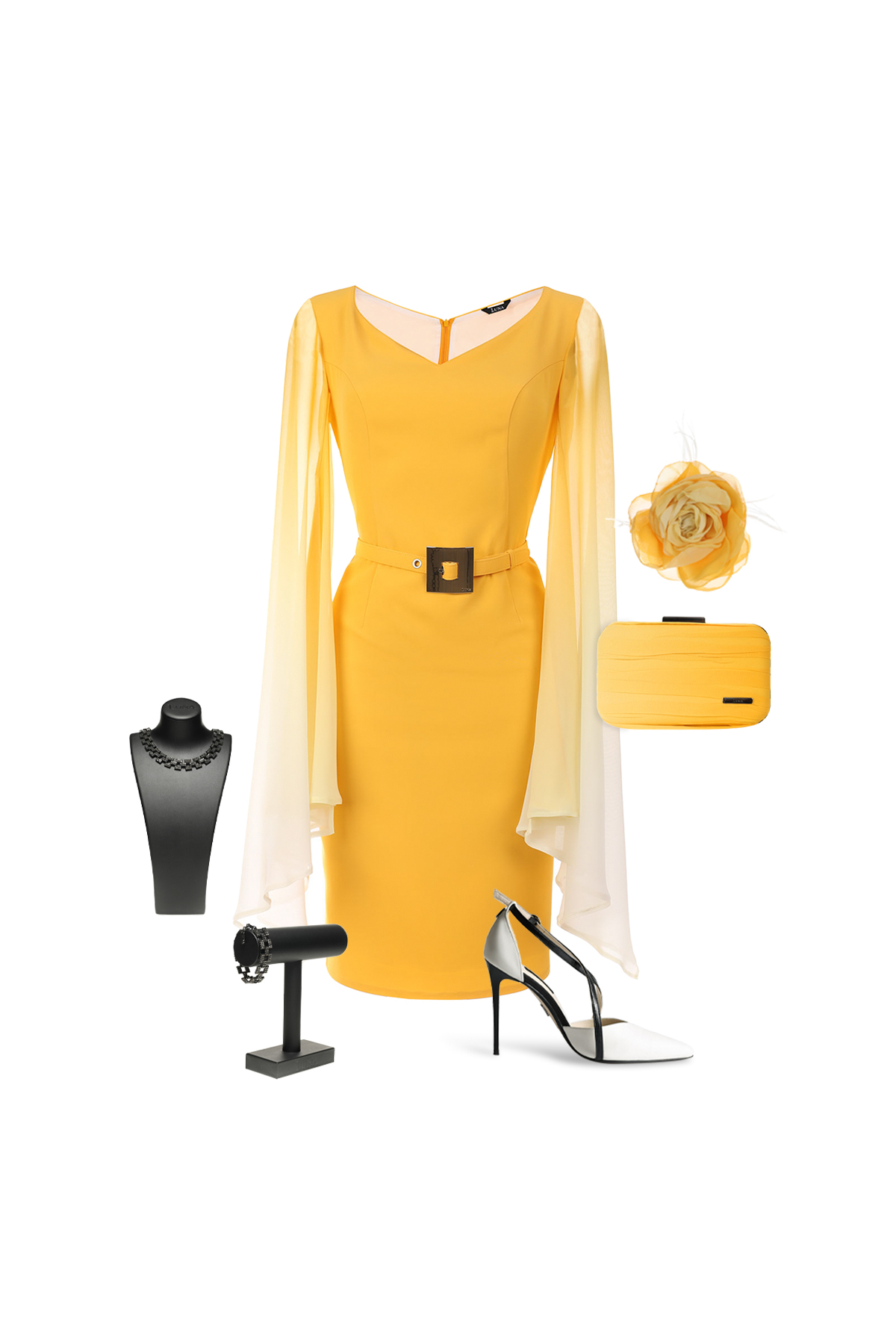 Elegantna žuta haljina uskog kroja sa lepršavim rukavima i kaišem koji suptilno naglaša...