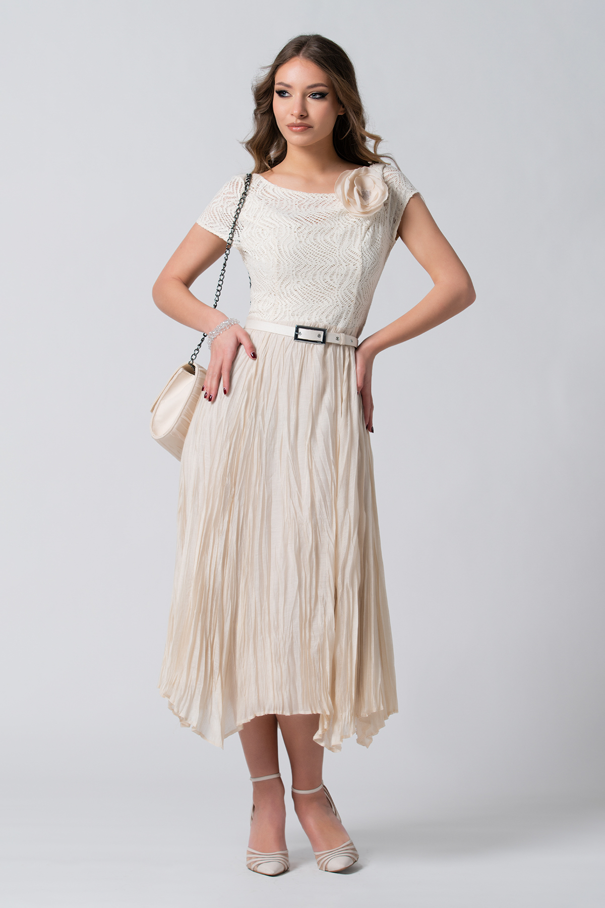 Lepršava midi haljina u bež boji, oplemenjena je čipkom u predelu biste.