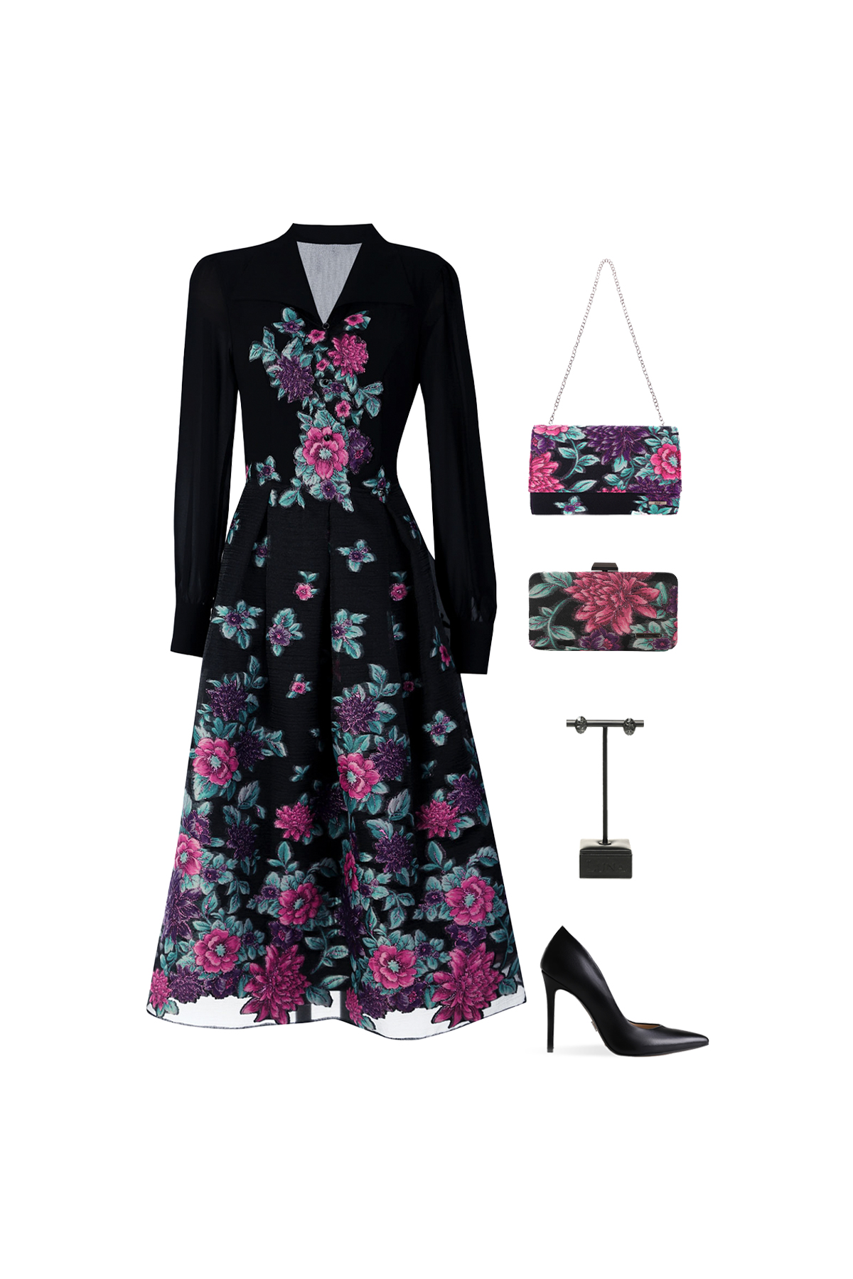Atraktivna midi haljina cvetnog dezena sa V izrezom i dugim rukavima.