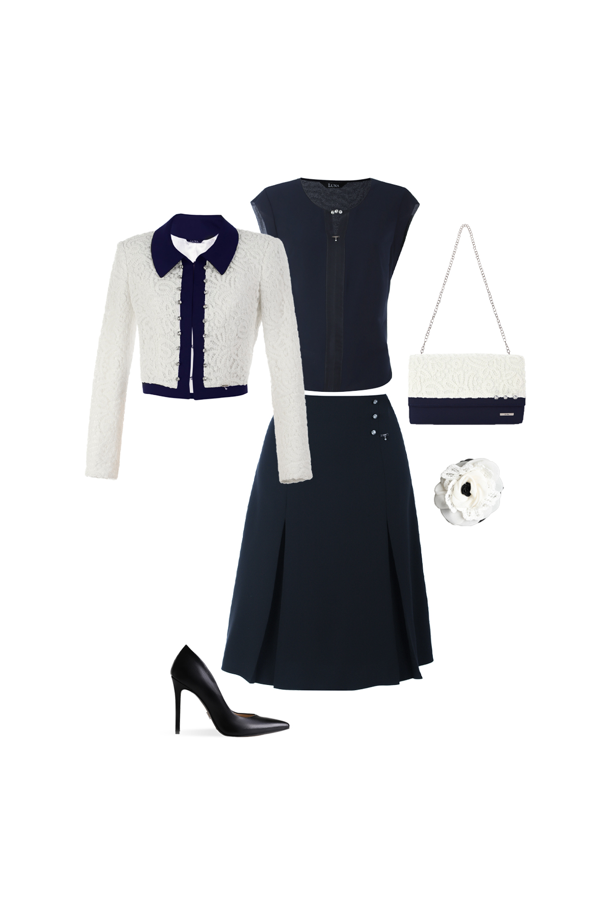 Elegantni čipkasti sako dužine do bokova u kombinaciji bele i teget nijanse.