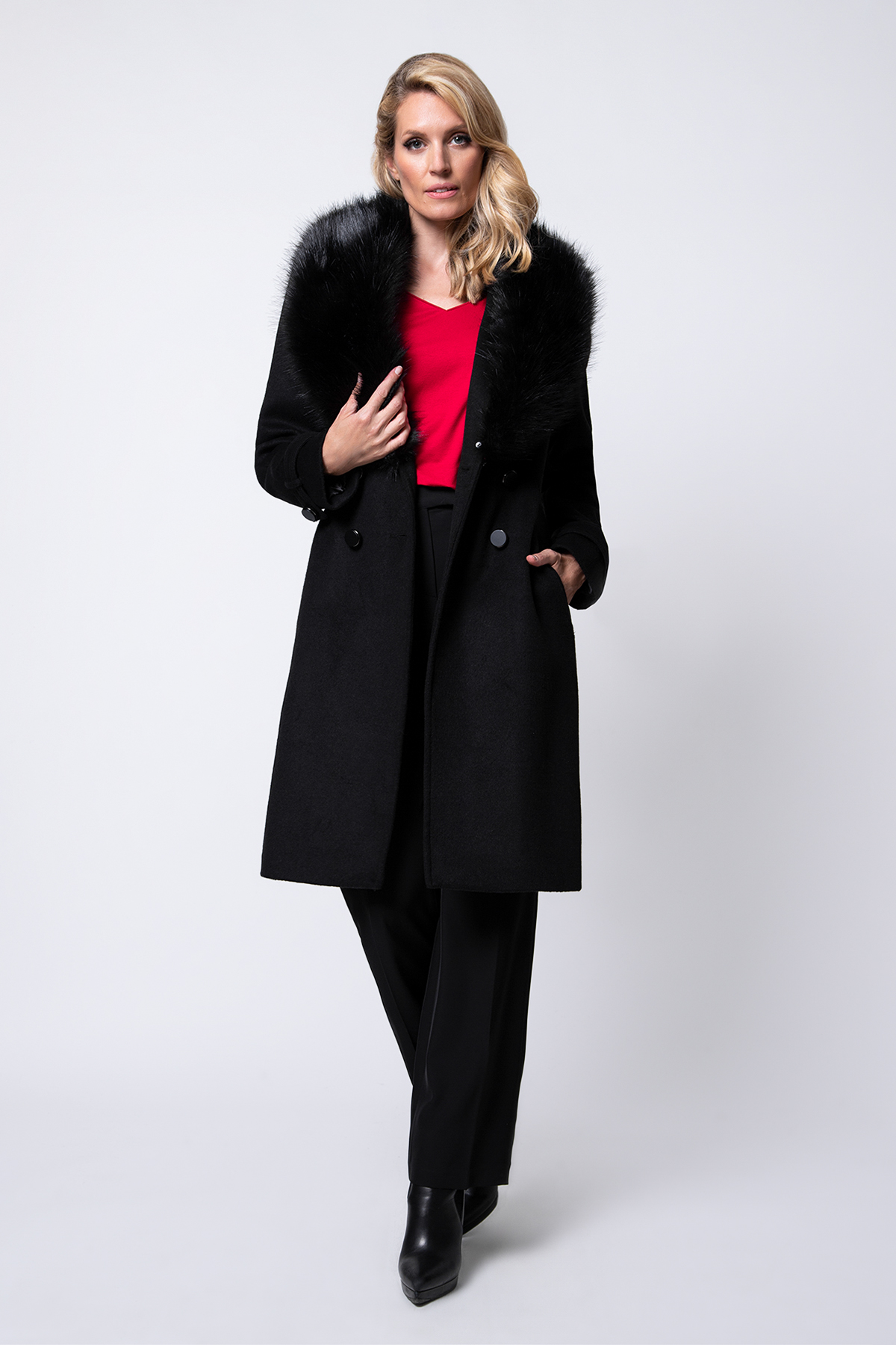 Elegantni kratki kaput sa dvorednim kopčanjem i pojasom na vezivanje koji možete nositi...