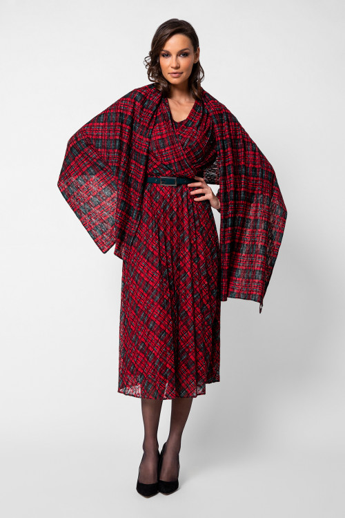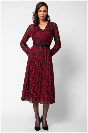 Plisirana duga haljina kariranog dezena odlično pristaje svim tipovima građe.