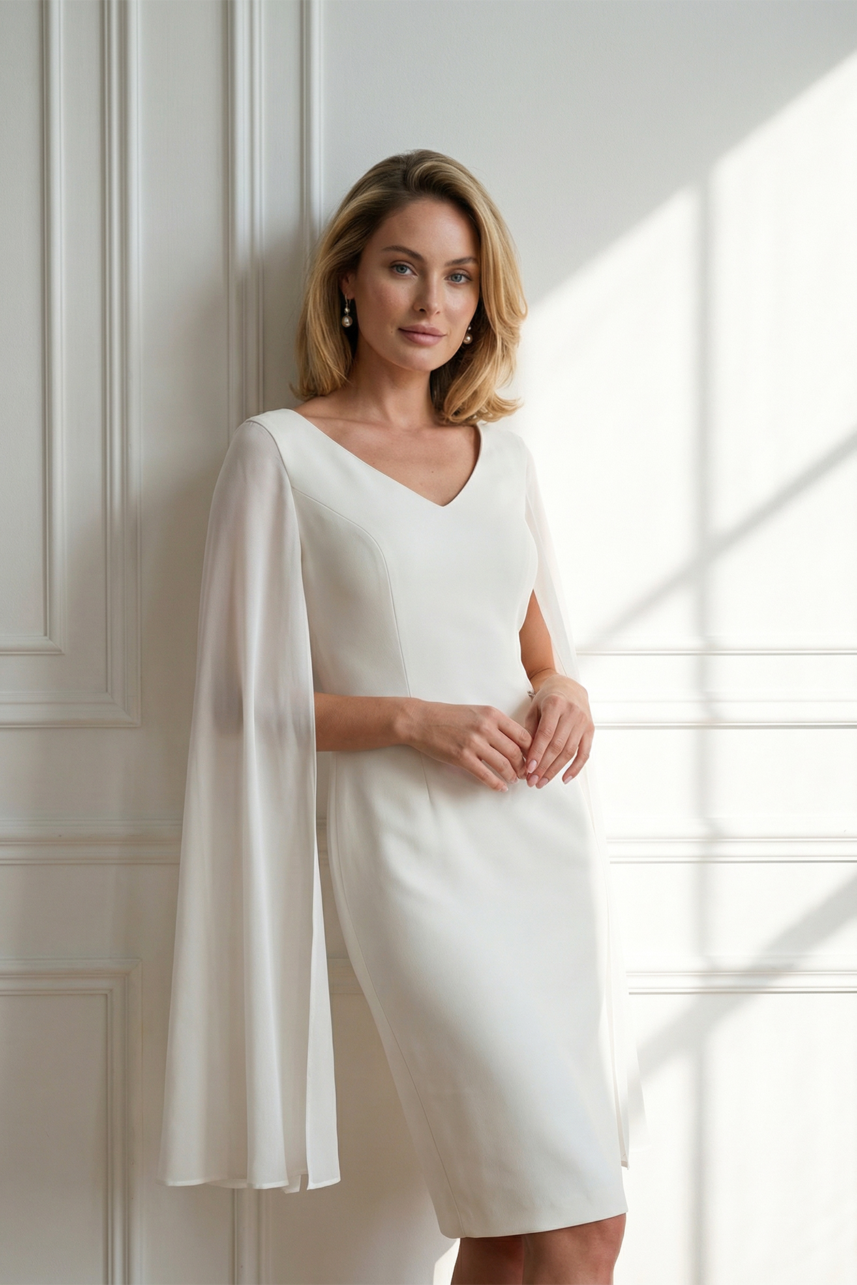 Elegantna, usko krojena haljina u krem nijansi sa V-izrezom, odvojivim lepršavim rukavi...