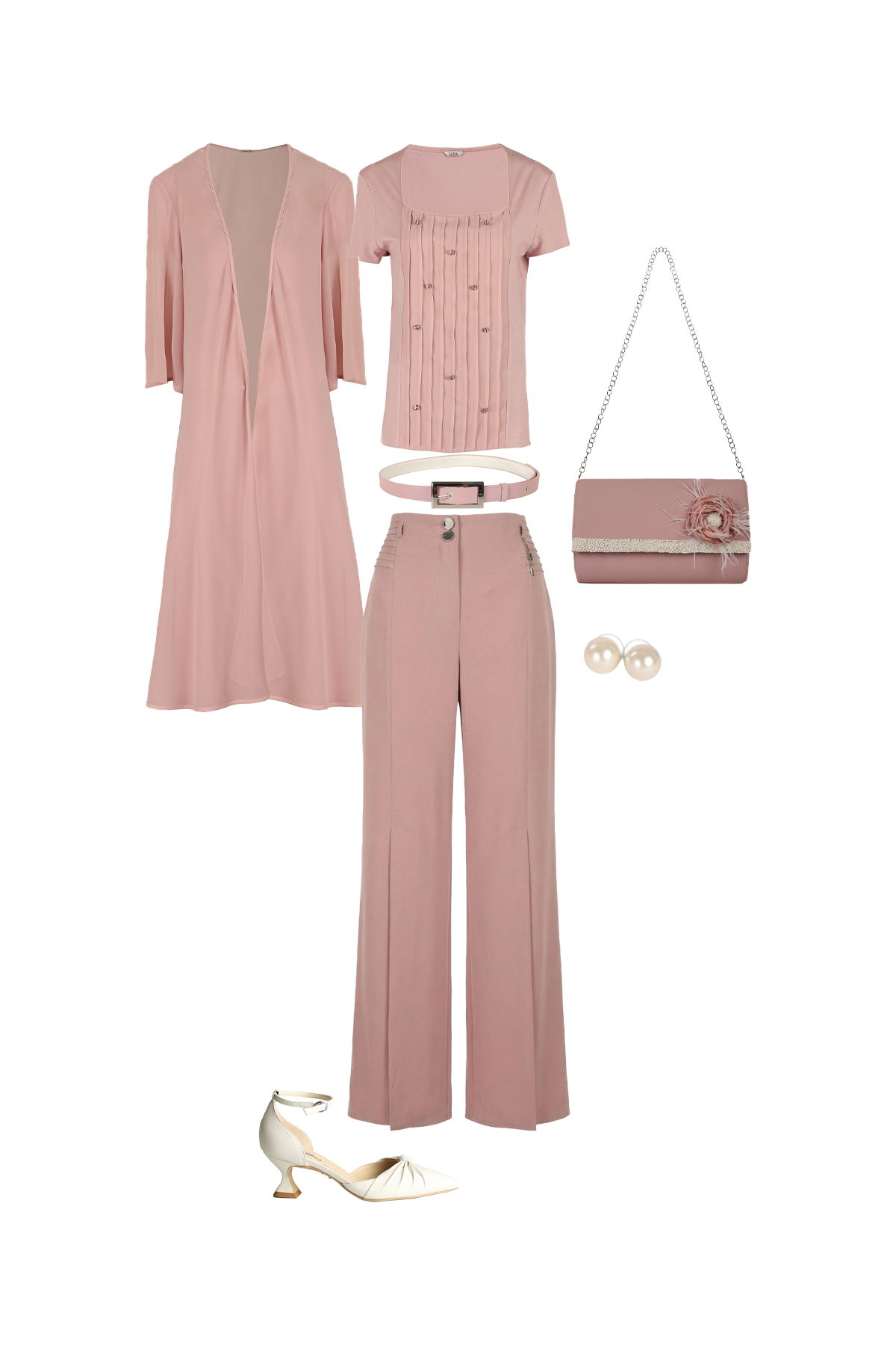 Elegantne puder roze pantalone visokog struka sa sofisticiranim detaljima i širokim nog...