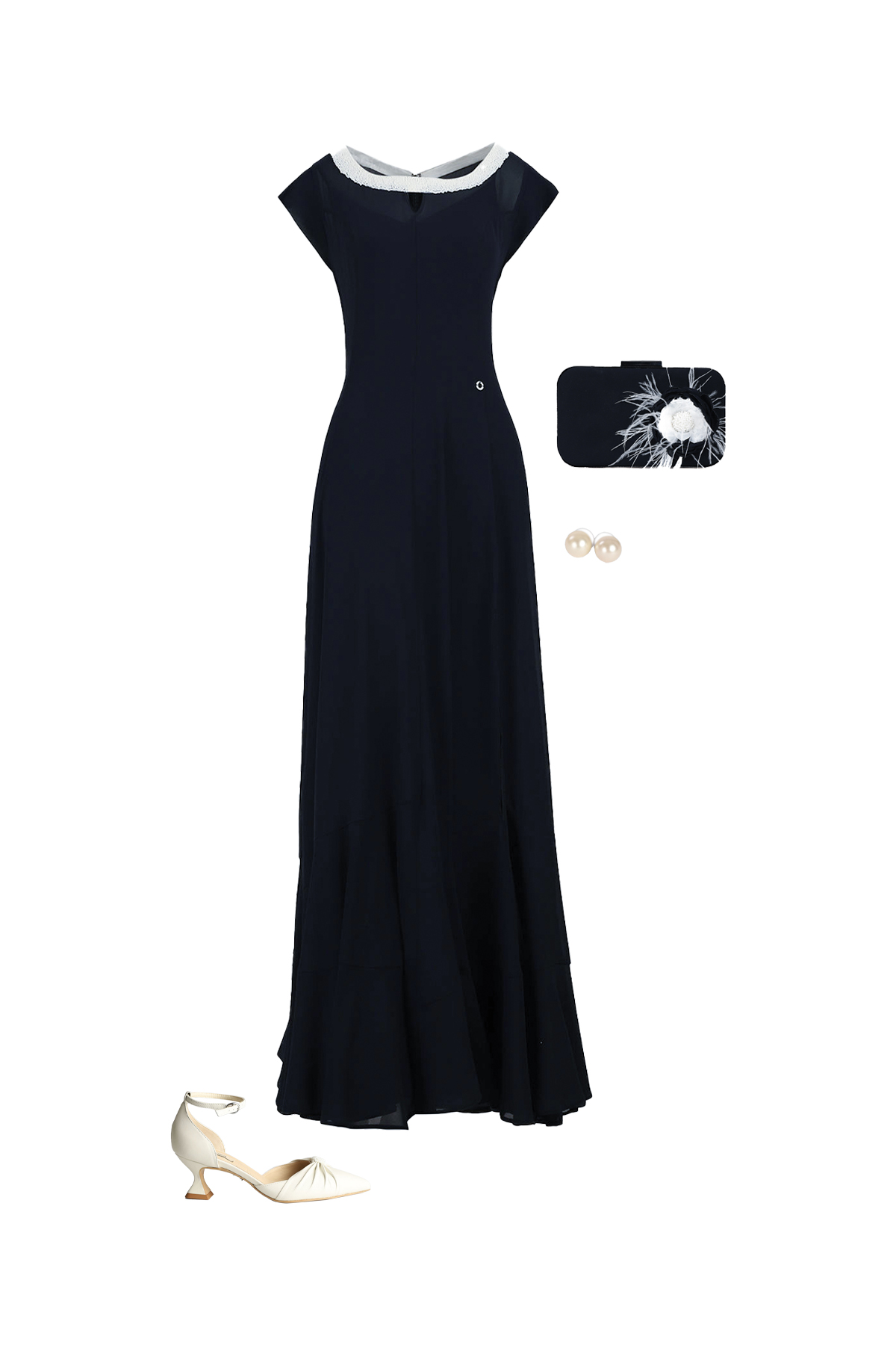 Duga teget haljina sa perlama na dekolteu i diskretnim prorezom predstavlja savršen spo...