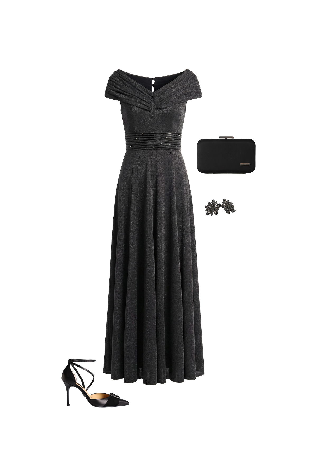 Antracit-crne salonke sa svetlucavom teksturom, dekorativnom broš-aplikacijom i stabiln...