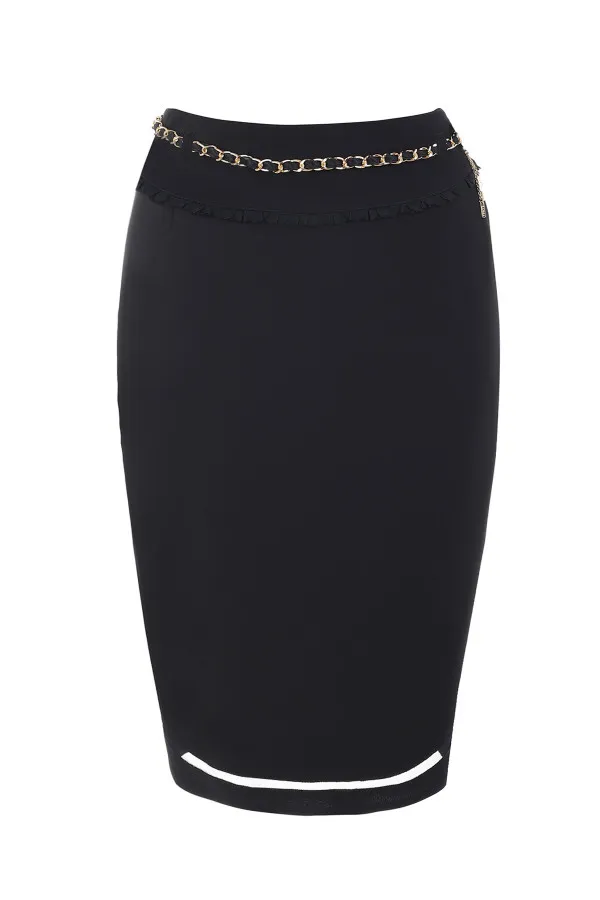 Klasična uska suknja od viskoznog štofa sa elastinom oplemenjena je ukrasnim kaišem u vidu lanca na struku, što ovom modelu daje posebnu notu elegancije. Udobnost je zagarantovana zahvaljujući veoma udobnom viskoznom štofu koji u sebi ima elastina, a viskozna postava ispod pružiće Vam dodatnu sigurnost i udobnost. U kompletu sa sakoom iz iste linije Vaš outfit biće savršeno stilizovan.