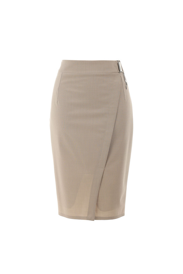 Elegantna uska suknja napravljena je od štofa glatke teksture koji u sebi sadrži vunu. Mekan na dodir, ovaj štof je i dosta rastegljiv čemu doprinosi elastin u materijalu, a njegova glavna prednost je to što se ne gužva. Njen uski kroj koji prati liniju tela na veoma sofisticiran način istaći će Vašu figure. Ukoliko je kompletirate sa sakoom istog dezena, dobićete stilski savršeno uklopljen outfit, spreman kako za poslovne tako i sve druge prilike.