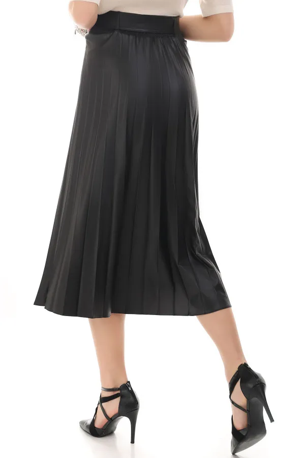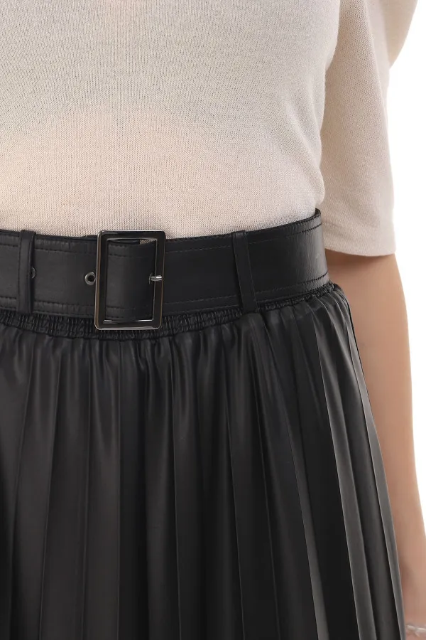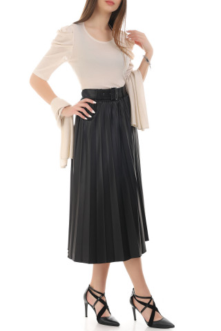 Elegantna plisirana suknja širokog kroja. Materijal od kog je napravljena ima efekat veštačke kože, što ovom modelu daje posebnu notu atraktivnosti.Vanvremenski stil ovog modela pogodan je za mnoge prilike kako poslovne tako i svakodnevne i svečane. Njen širok kroj odlično pristaje svakoj građi tela, posebno damama kojima su bokovi izraženiji od struka. Lastiš pojas doprinosi da ovaj model sa lakoćom nosite, i veoma lako se prilagođava Vašem obimu. Kaiš ide uz suknju i po potrebi ga možete skinuti.