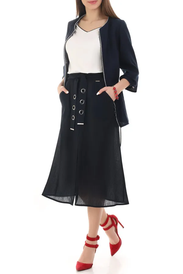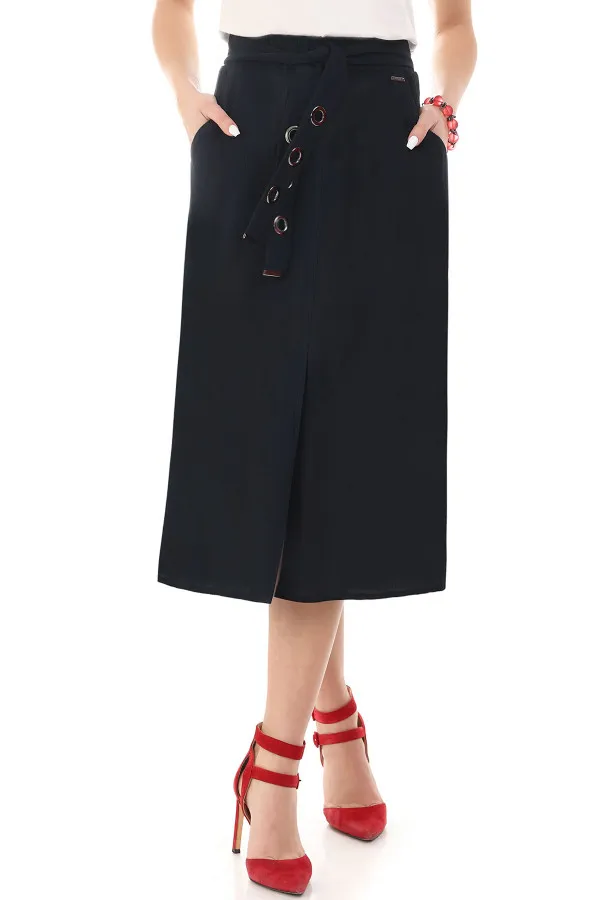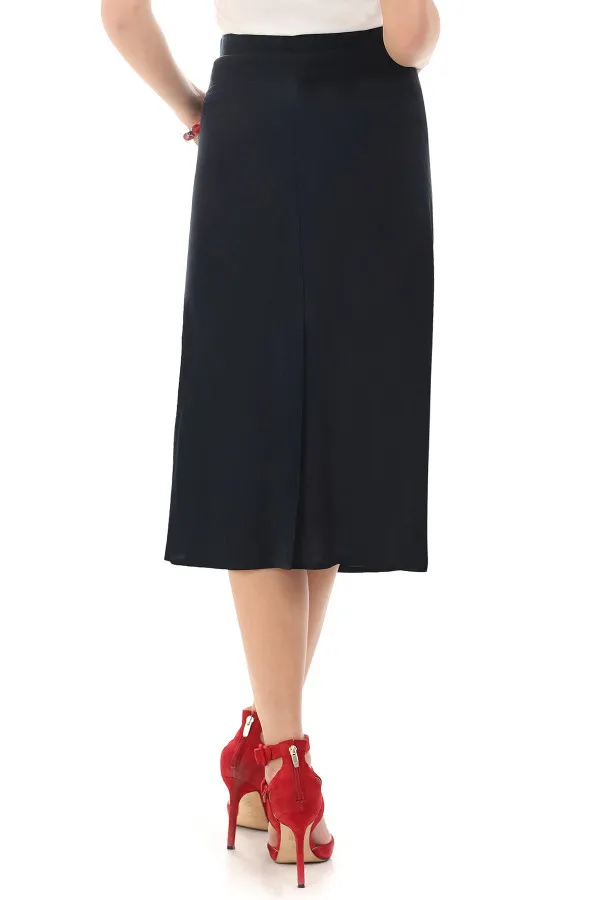 Elegantna suknja, ravnog kroja srednje dužine, savršena je za uklapanje u različitim stilovima, elegantnim ali i ležernijim. Izrađena je od viskozne tkanine sa elastinom i postavom takođe od prirodnog materijala koja dodatno čini prijatnom za nošenje. Pojas je rastegljiv i savršeno se prilagodjava struku. Idealna je za poslovne autfite u toplijim danima, ali i za sve opuštenije modne kombinacije u zavisnosti od obuće i drugim komada sa kojima se kombinuje.