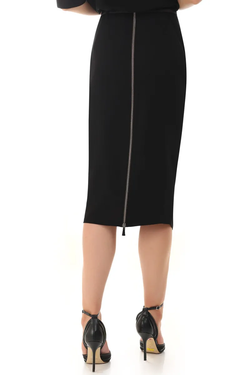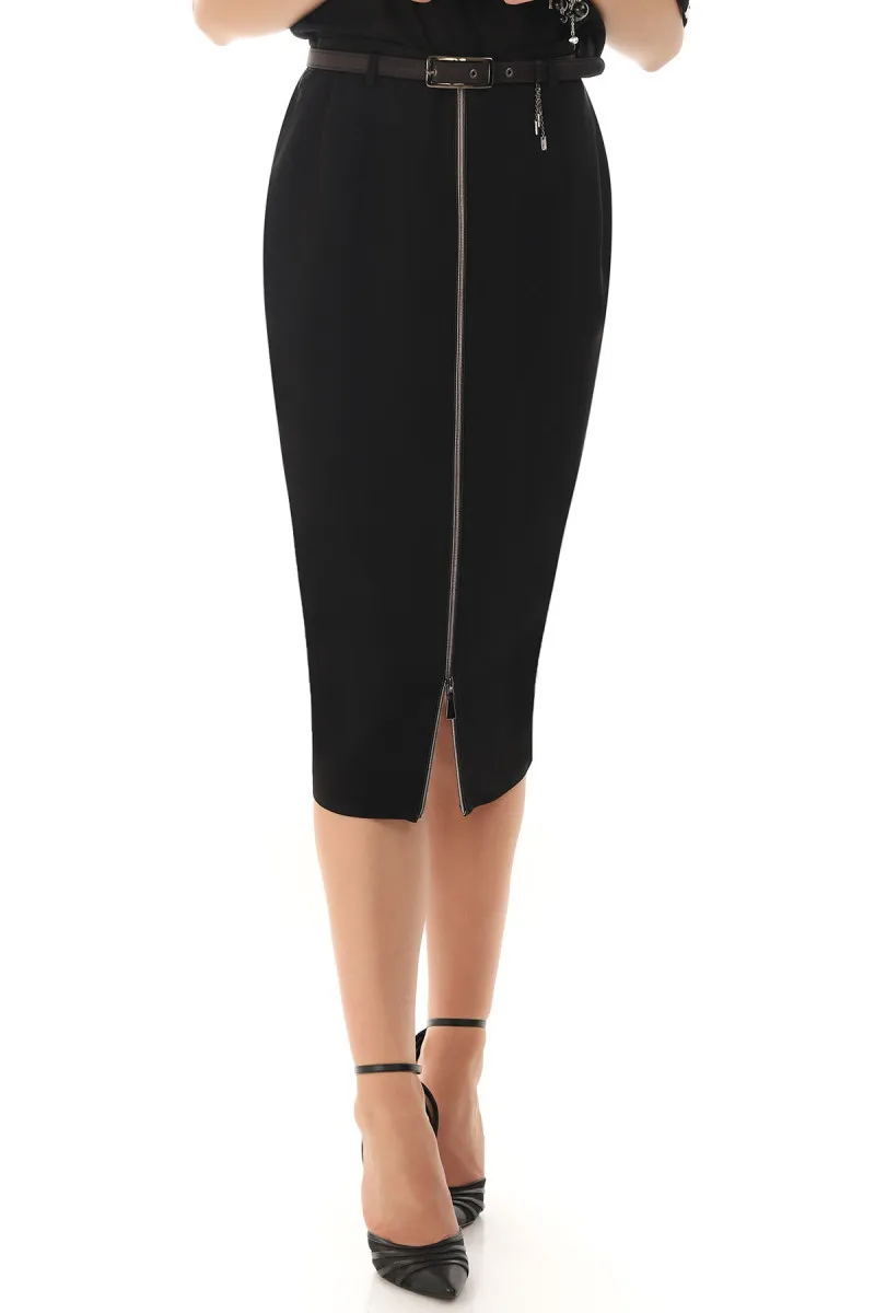 Dubokog struka, dužine ispod kolena, ova viskozna suknja savršeno prati liniju tela. Šik izgled ove suknje pojačan je rajsferšlusima sa prednje i zadnje strane. Namenjena samosvesnim ženama koje žele biti u centru pažnje.