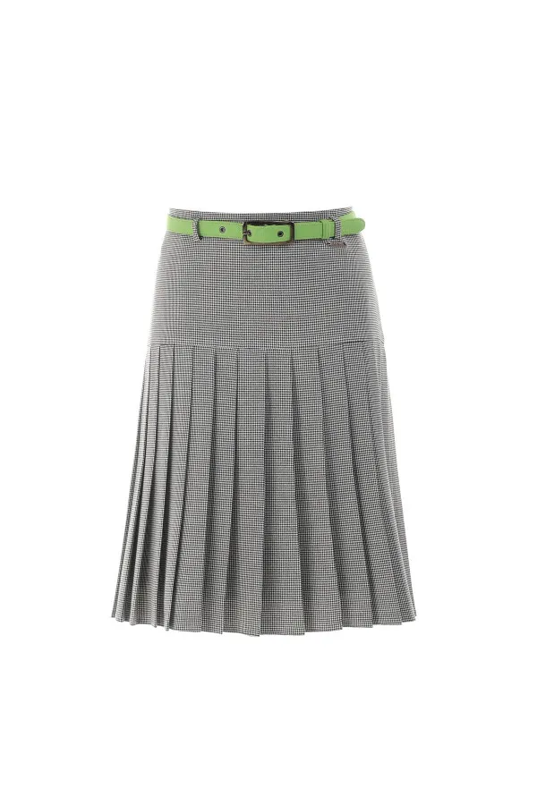 Široka plisirana suknja kariranog dezena. Ova svetlo-siva plisirana suknja, sitno karikanog dezena, odiše spojem klasike i romantike. Zeleni kaiš, koji se po trebi može skinuti, doprinosi finalnom urbanom izgledu. Suknju možete iskombinovati sa komplementarnim komadima iz linije Lora.