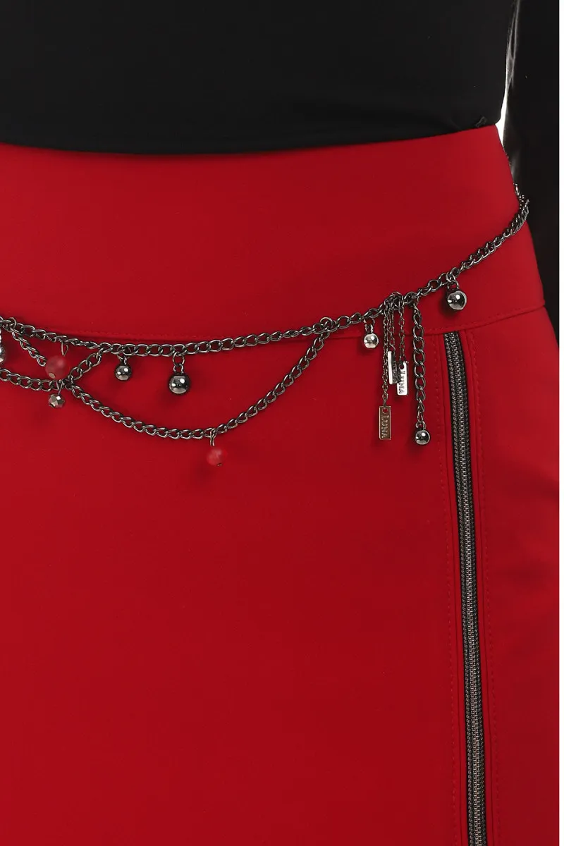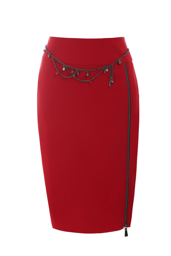 Pencil suknja crvene boje je odevni komad namenjen smelim ženama. Kroj prati liniju tela i ističe ženstvenost na suptilan način. Šik izgled ove suknje je pojačan rajsferšlusom u prednjem delu uz pomoć koga možete podsetiti dubinu šlica u zavisnosti od prilike. Ukrasni lanac je tu da ovu suknju učini dodatno zanimljivom.