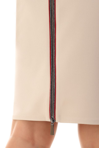 Pencil suknja bež boje je vanvremenski odevni komad. Kroj prati liniju tela i ističe ženstvenost na suptilan način. Rajsferšlus je podesiv pa sami možete odrediti dubinu šlica. Ukrasni lanac doprinosi atraktivnosti ovog modela. Za postizanje savršene stilske usklađenosti, predlažemo da je kombinujete sa crvenom bluzom i sakoom iz iste linije.