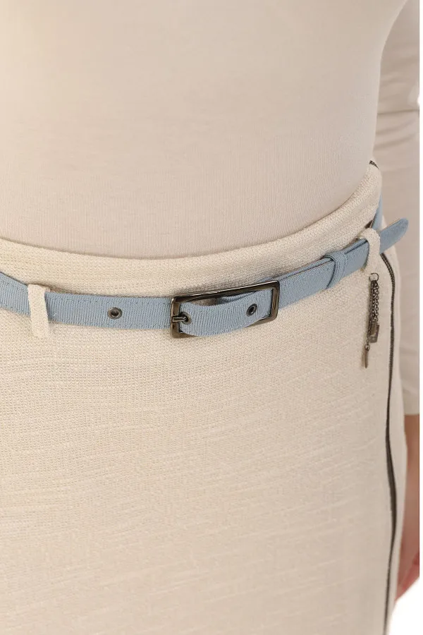 Trendi uska suknja neutralne, bež boje sa plavim kaišićem. Bočni rajsferšlus doprinosi atraktivnosti ovog modela jer sami možete podesiti dubinu šlica u zavisnosti od prilike. U kompletu sa sakoom iz iste linije Vaš outfit će biti savšreno stilski kompletiran.