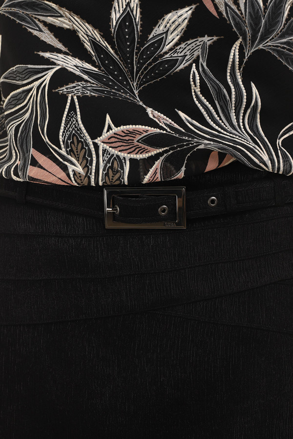 Ženstvena uska sunknja sa štepom u predelu bokova. Skrojena je od viskoze što je čini prijatnom i laganom za nošenje. U kombinaciji sa bluzom i sakoom iz iste linije, dobićete savršen kako poslovni tako i outfit za svečane prilike. Kaiš dodatno ističe Vaš struk, ali ga možete skinuti kada poželite.