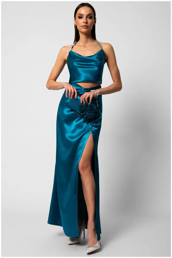 Elegantna duga suknja atraktivnog kroja. Model poseduje nabore sa prednje strane kao i šlic sa leve strane što ovu haljinu čini još atraktivnijom. U kombinaciji sa komplementarnim topom i bluzom iz prateće kolekcije stvorićete savršeno stilizovan look za svečane prilike.