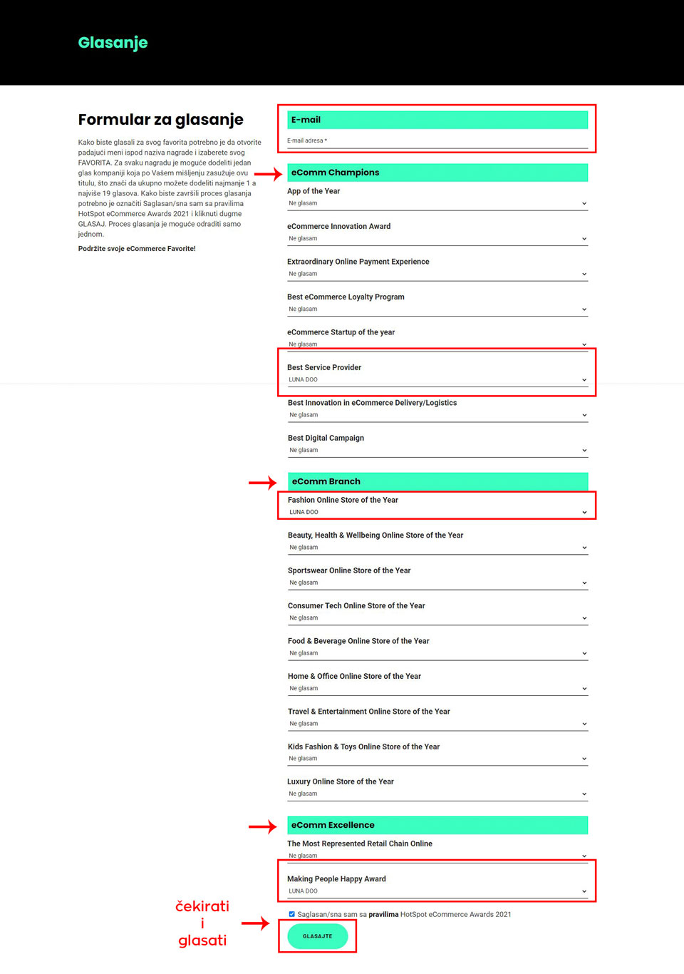 Prilikom glasanja potrebno je da upišete svoju e-mail adresu. U okviru gore navedene tri kategorije odaberite LUNA DOO iz padajućeg menija, čekirajte polje za saglasnost i glasajte ovde