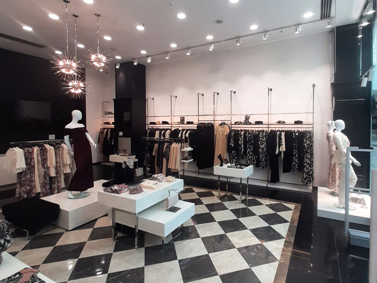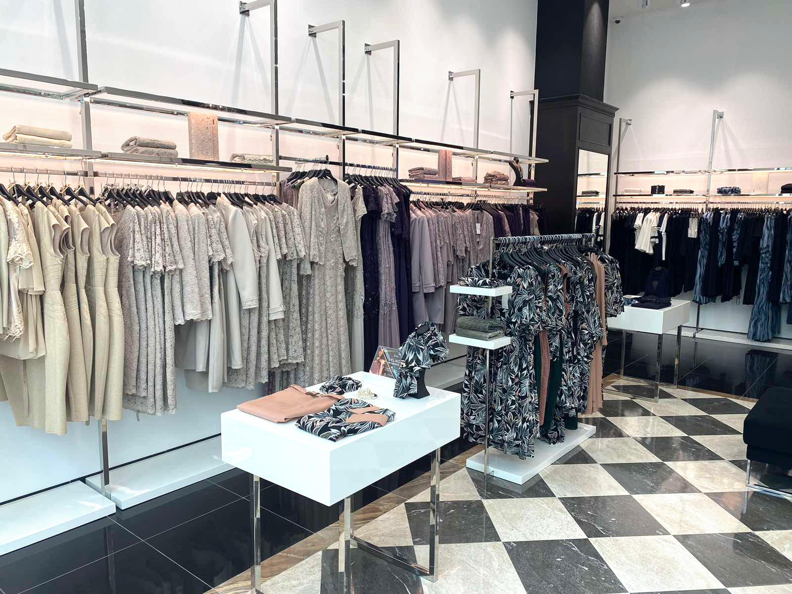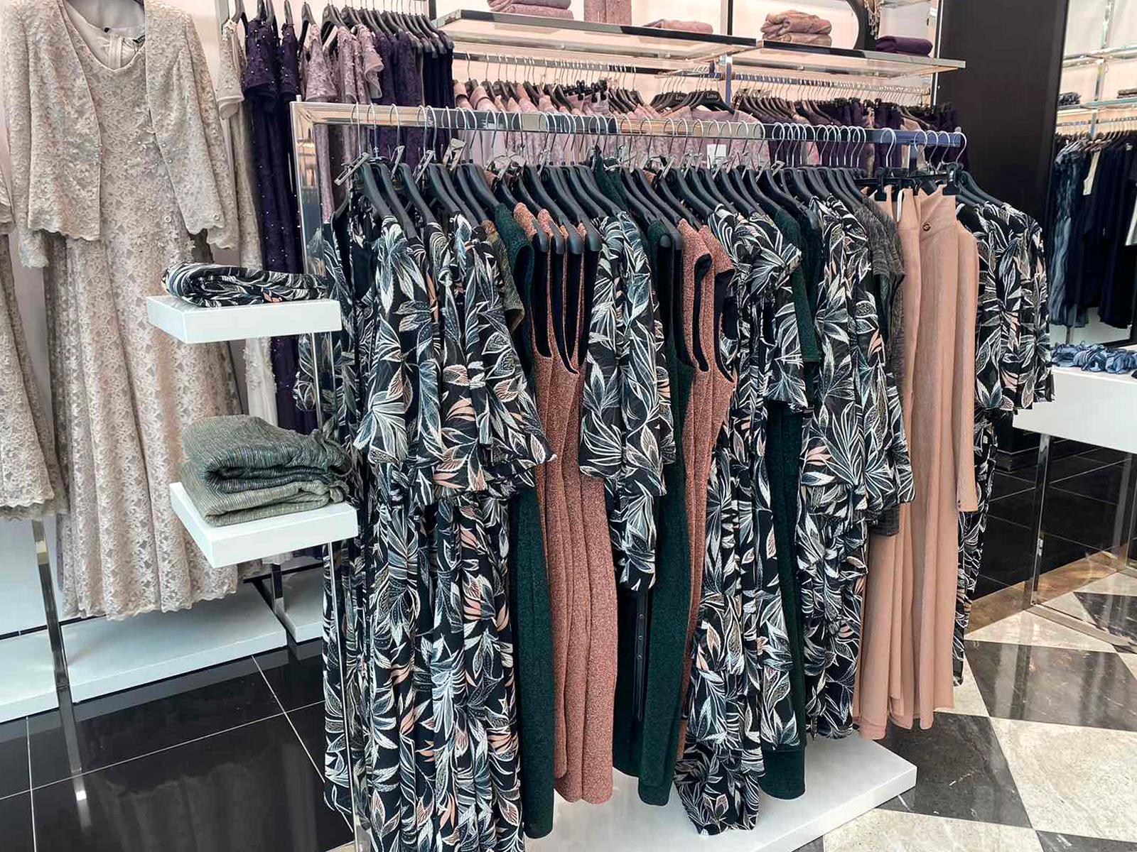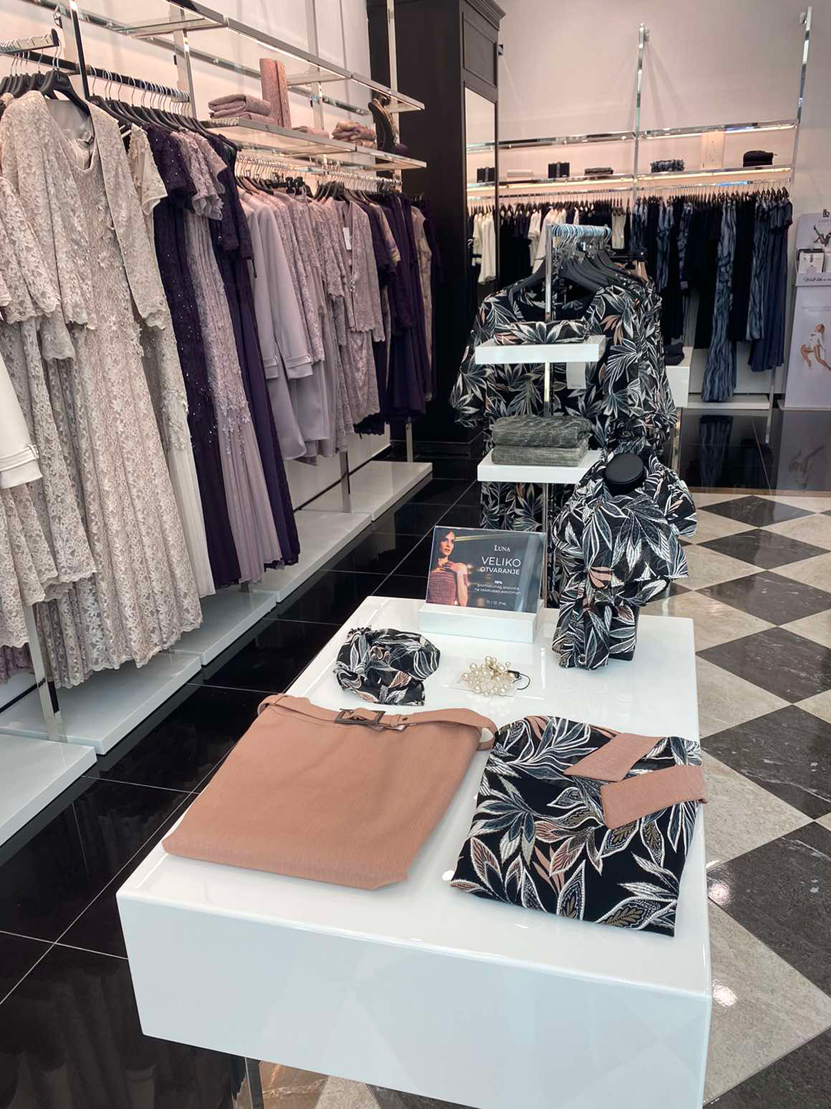 Na 100m2 ekskluzivnog, modernog i luksuzno uređenog prostora, ljubitelji mode će moći da uživaju u bogatom asortimanu aktuelne kolekcije Proleće/Leto 2023, koja obuhvata mnogobrojne svečane haljine, pantalone, suknje, sakoe, bluze i druge odevne komade.